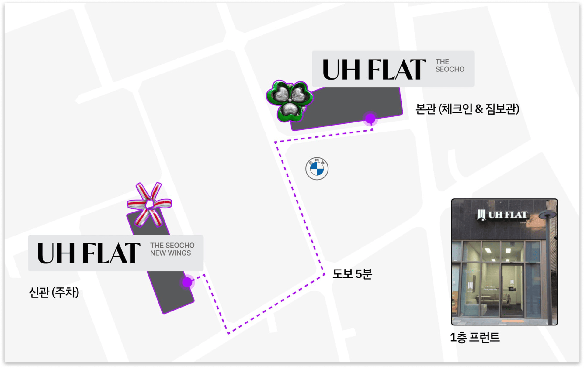 * 체크인 장소 : UH 플랫 더 서초 본관 A동 102호 프론트 데스크 (객실 비밀번호 제공)